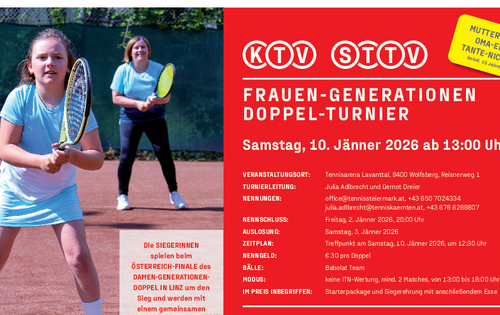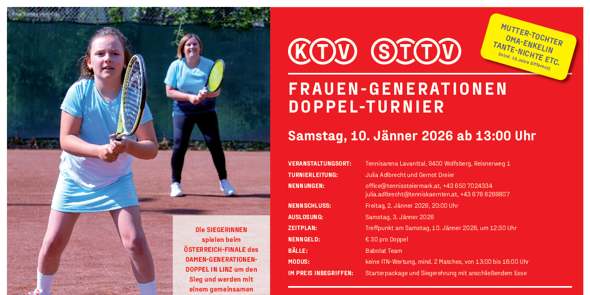 Am Samstag, 10. Jänner 2026 ist es wieder soweit: Das beliebte Frauen-Generationen Doppelturnier findet in der Tennisarena Lavanttal in Wolfsberg statt. Ein Event, das nicht nur sportliche Höchstleistungen, sondern auch familiären Teamgeist in den Mittelpunkt stellt.