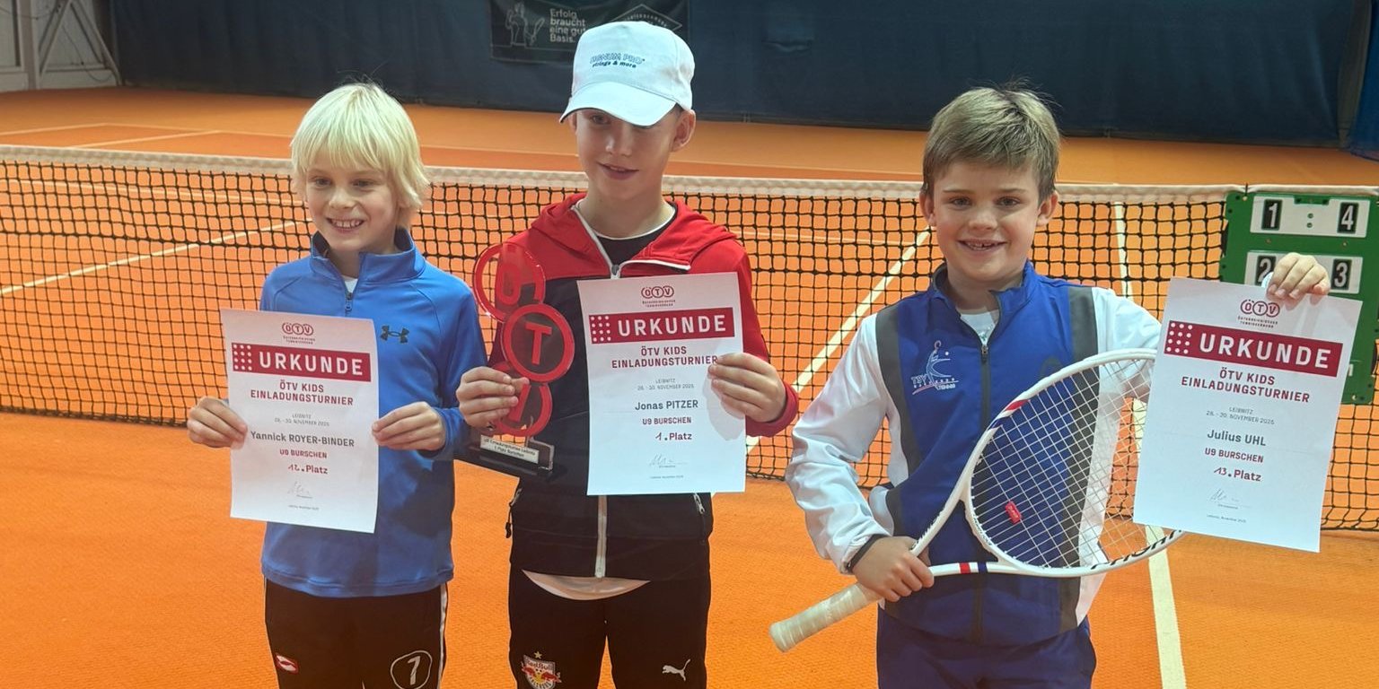 Das LLZ Leibnitz war von 28.-30.11. Austragungsort des ÖTV U9 Pro Kids Einladungsturniers, bei dem die drei Burschen Julius Uhl (TSV Hartberg), Yannick Royer-Binder und Jonas Pitzer (beide TC Union Schladming) aufgrund ihrer Leistungen im vergangenen Jahr von ÖTV Kidskoordinator Martin Kondert eingeladen wurden. Jonas Pitzer konnte den Heimvorteil optimal nützen und holte sich in beeindruckender Manier den Turniersieg! Nach klaren Siegen in den Gruppenspielen konnte er sich im Finale gegen den Oberösterreicher Johann Steininger knapp mit 4/2 0/4 10/4 durchsetzen.
