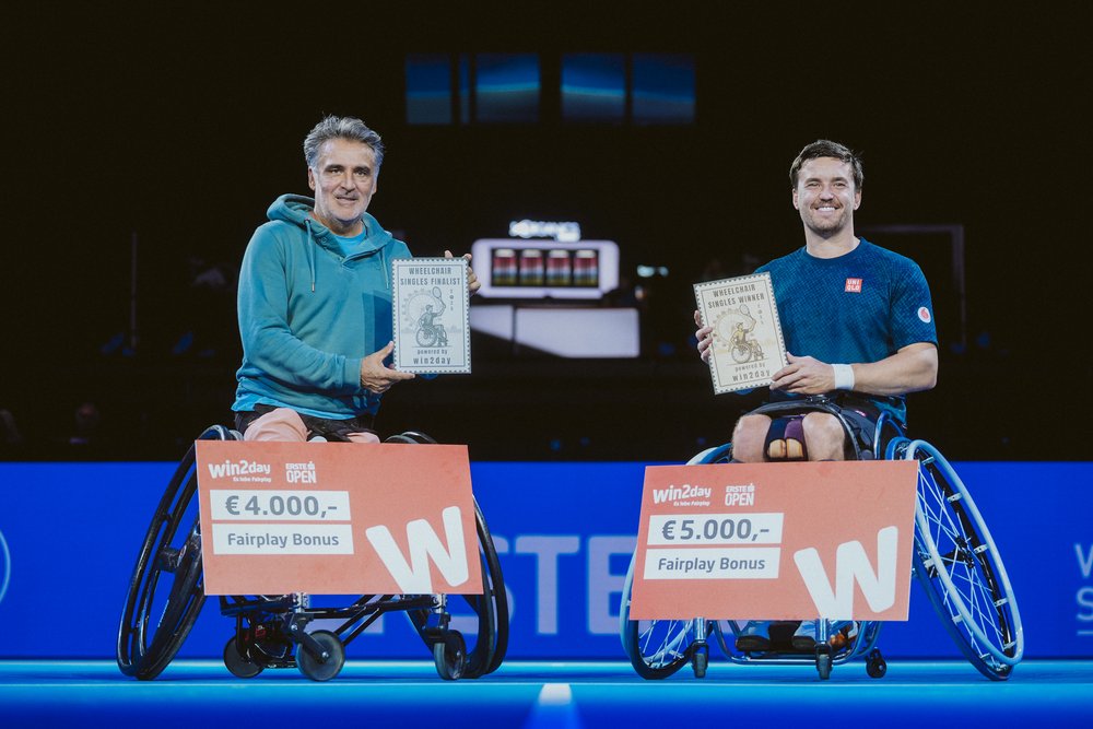 Bei der Premiere des Rollstuhltennisturniers im Rahmen der Erste Bank Open ging Gordon Reid als Sieger hervor. Der britische Weltranglistenfünfte bezwang am Samstag im Finale in der Stadthalle den Franzosen Stéphane Houdet, die Nummer sechs der Weltrangliste, mit 6:3, 6:1 und wurde dafür mit einem Siegerscheck in Höhe von 5000 Euro belohnt. „Es war eine unglaubliche Erfahrung, hier zu sein. Jeder hier hat uns von der ersten Minute an große Wertschätzung entgegengebracht, man fühlt sich als Teil der Turnierfamilie. Besonders heute auf dem Centre Court mit der Stimmung hat es großen Spaß gemacht, davon träumt man als Spieler“, sagte Reid nach seinem Triumph. Auch bei dem in Gruppenspielen ausgetragenen Doppelturnier jubelte Reid mit seinem belgischen Partner Joachim Gérard über den Sieg. In der abschließenden Partie feierten Gerard/Reid gegen „Playing Ambassador“ Nico Langmann und Alwande Sikhosana (Südafrika) mit 6:1, 6:4 den zweiten Sieg in ihrem zweiten Spiel.